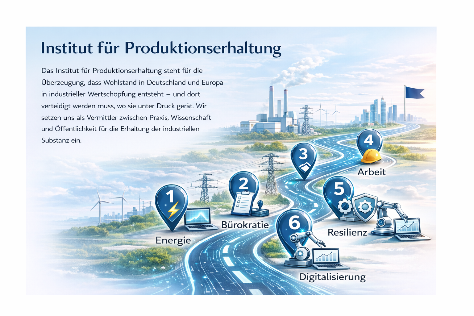 Das Institut für Produktionserhaltung steht für die Überzeugung, dass Wohlstand in Deutschland und Europa durch industrielle Wertschöpfung entsteht – und dort verteidigt werden muss, wo sie unter Druck gerät. Wir setzen uns dafür ein, Produktion am Standort zu sichern, Wettbewerbsfähigkeit realistisch zu bewerten und die Voraussetzungen für Investitionen, Innovation und Lieferfähigkeit sichtbar zu machen. Produktionserhaltung bedeutet dabei mehr als Bestandsschutz: Es geht um technologische Souveränität, robuste Lieferketten und verlässliche Rahmenbedingungen für den Mittelstand ebenso wie für große Industriekerne. Wo Wertschöpfung abwandert, verliert ein Land nicht nur Arbeitsplätze, sondern Kompetenz, Innovationskraft und Gestaltungsspielraum. Infpro versteht sich als Vermittler zwischen Praxis, Wissenschaft und Öffentlichkeit – mit dem Anspruch, Debatten zu versachlichen und Entscheidungen auf Fakten zu gründen. Ziel des Instituts ist es, die industrielle Substanz zu erhalten und damit die Grundlage von Wohlstand, Stabilität und Handlungsfähigkeit zu sichern.