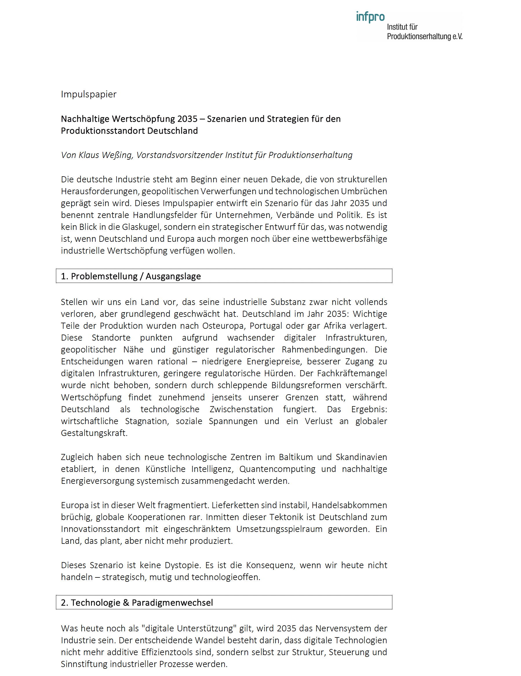 Deutschland steht vor einer industriepolitischen Zäsur. Global fragmentierte Märkte, technologische Umbrüche und ökologische Zielkonflikte verändern die Grundlagen von Produktion und Wertschöpfung – dauerhaft. Was heute noch als Standortvorteil gilt, kann morgen bereits zur strukturellen Schwäche werden. Das neue Impulspapier von infpro liefert ein realistisches, aber konstruktives Szenario für das Jahr 2035 – und skizziert die notwendigen Weichenstellungen im Hier und Jetzt.